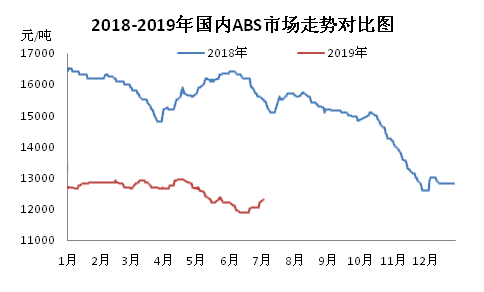 2019年上半年國內(nèi)ABS塑料市場震蕩運(yùn)行后深跌再小漲,以余姚市場0215A為例,1-6月份價格運(yùn)行區(qū)間在11900-12950元/噸。
