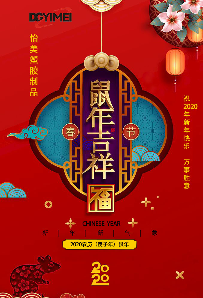 新年在即,萬(wàn)象更新,2020年新的一世紀(jì)鼠年春節(jié)即將來(lái)臨,東莞市怡美塑膠制品有限公司全體員工衷心的感謝您長(zhǎng)期的鼎力支持與理解,2020年新的一年,讓我們事業(yè)再上新臺(tái)階,創(chuàng)造更輝煌的明天!在新的一年里我司會(huì)更加的努力,為您提供更好的產(chǎn)品和服務(wù)。