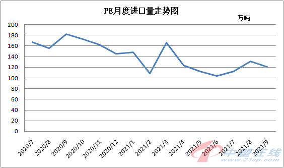 據(jù)海關(guān)統(tǒng)計(jì),2021年9月我國(guó)聚乙烯當(dāng)月進(jìn)口量在120.43萬噸,環(huán)比減少8.12%,同比減少33.78%。其中LDPE(稅則號(hào)39011000)進(jìn)口約25.14萬噸,環(huán)比減少6.19%,同比減少23.89%;HDPE(稅則號(hào)39012000)進(jìn)口約56.78萬噸,環(huán)比增減少5.08%,同比減少39.49%;LLDPE(稅則號(hào)39014020)進(jìn)口約38.51萬噸,環(huán)比減少13.36%,同比減少29.98%。1-9月累計(jì)進(jìn)口量為1126.18萬噸,同比減少33.78%。導(dǎo)致9月份中國(guó)聚乙烯進(jìn)口量同、環(huán)比雙雙回落的主要原因:1、歐美等地持續(xù)高價(jià)格的影響,中東貨源更多的被吸引;2、中國(guó)市場(chǎng)(7、8月份)正處于需求淡季,聚乙烯價(jià)格處低位,對(duì)中東及東南亞地區(qū)貨源吸引有限,內(nèi)外盤持續(xù)倒掛影響下,外商主動(dòng)遞盤量難有放量